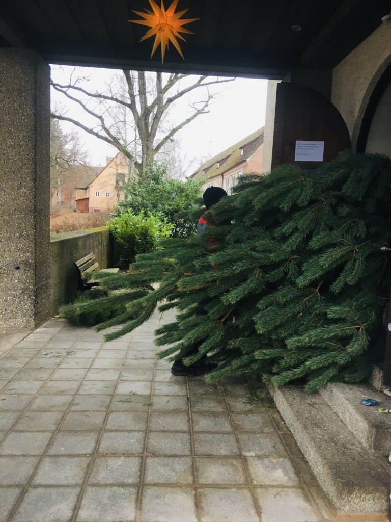 Wie jedes Jahr haben wir uns den Baum vorher angeschaut. Uns ist immer wichtig einen Baum auszuwählen, der sowieso gefällt werden würde. Seine Größe hat auch gut gepasst, wir haben nur die Dicke des Stamms und damit das Gewicht des Baumes deutlich unterschätzt. Die folgenden Bilder geben einen Einblick in den Transport und das anschließende Schmücken des Baumes: